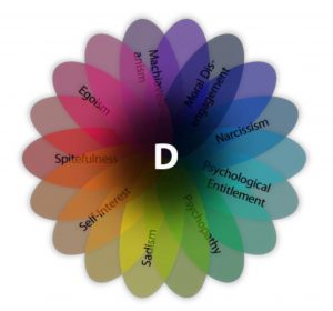 Factor D (The Dark Core of Personality) se forma por 9 rasgos. El factor D consiste en vivir sólo interesado en cumplir los propios objetivos, deseos, motivaciones y expectativas, por encima de cualquier otra persona o circunstancia, llegando incluso a disfrutar con el daño que se causa a terceros.