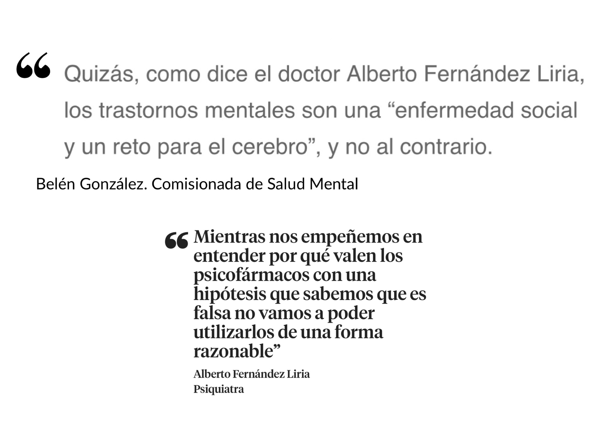 Pero el Comisionado de Salud Mental vuelve a negar la Psiquiatría Médica en sus mensajes mediáticos. Algunas de las entrevistas en medios denominan a la Psiquiatría Médica como reduccionista. Sin embargo es desde el Ministerio, desde donde se está negando la existencia de las enfermedades psiquiátricas. Esto conlleva el riesgo de que los pacientes que requieren tratamiento para su estabilidad, no lo cumplan adecuadamente.
