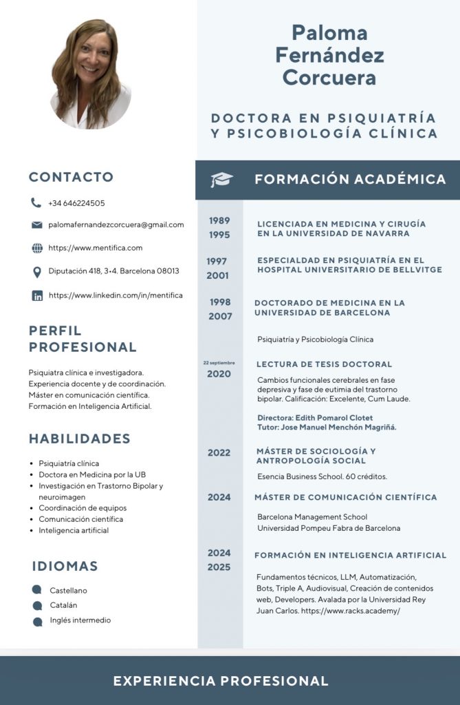 Mentífica está impulsada por la Dra. Paloma Fernández Corcuera, psiquiatra clínica e investigadora, con trayectoria en asistencia, docencia, investigación y divulgación científica.